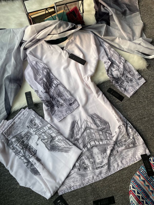 We used premium weightless georgette fabric for kameez and pant ( digital printed ) & we used single butter fabric for the inner only. Duppatta is also made with digital printed Weightless georgette.