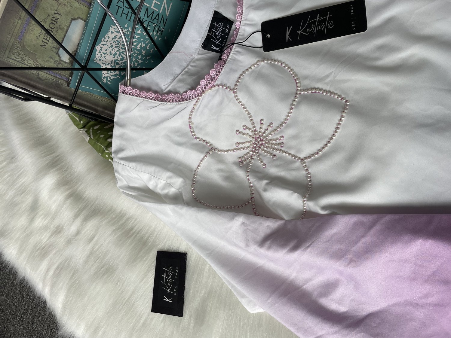 Pink shades and sky shades with floral pearls work three piece set only available at - Kurtiistic.